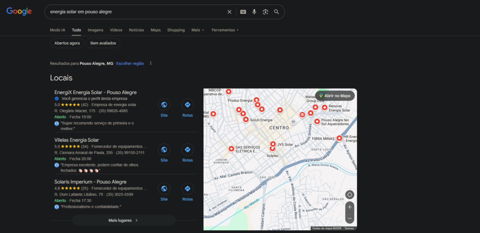 A Energix saiu do comum e passou a disputar as primeiras posições nas buscas locais. Hoje aparece no TOP 1 quando alguém pesquisa “energia solar em Pouso Alegre”, aumentando visibilidade, autoridade e vendas.